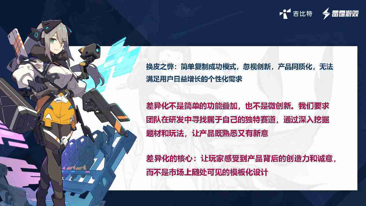 在我们内部是这么定义差异化的。。首先,,,,差异化不是简单的功能叠加,,,,更不是换皮。。。只是换皮,,产品无法提供有效的市场价值。。。内部经常说差异化的产品不是为了迎合市场,,,,而是找到一个自己独特的表达方式,,在研发中找到属于自己的细分赛道和独特赛道,,,前提是需要对这个题材有足够的深入、、挖掘,,,,对玩法有足够深入的理解,,让产品看起来既熟悉又有新意。。。。