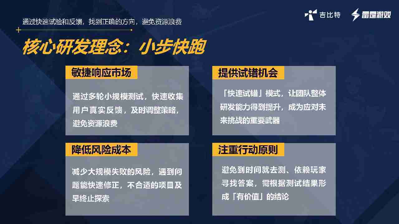 小步快跑不是找答案,,而是验证答案。。。。我们之前有项目是这样的,,,有些制作人会有几个方向觉得都可以做,,,但是不确定做哪一个,,,,会选择几个都做,,,,做完拿到市场跑,,,跑出哪一个更好,,,基于这个再做后续的研发和拓展。。但这种情况最容易出现一个问题,,,可能被玩家裹胁,,,玩家说这个点不错、、、那个点不错,,,,到底听还是不听,,,,不听感觉是无视玩家的反馈,,,,听的话,,,可能自己没想清楚导致研发思路发生偏颇。。。所以针对这一点后面自己复盘整理,,,,发现制作人自己心里要有数,,,,要做自己觉得好玩的,,,,而且明确知道这个东西是你想做的,,,然后拿到市场验证这个答案是不是对的,,而不是拿一堆答案找哪一个答案更好。。