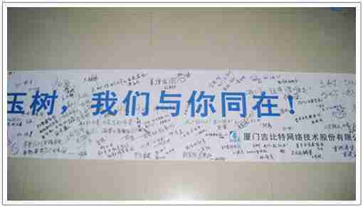 在募捐现场,,,,35273同学们怀着沉重的心情,,将每一笔捐款投入募捐箱,,,并在现场设置的横幅上,,,写上了对玉树人民的深情祝福。。。。满载35273祝福的横幅将和捐款一起抵达玉树,,希望谨以此微薄之意,,,为玉树人民带去35273的爱心与祝福,,希望吉祥、、、幸福的阳光能早日驱散灾难的阴霾,,,普照在玉树人民的身上,,,鼓励他们坚强、、、、勇敢与乐观。。