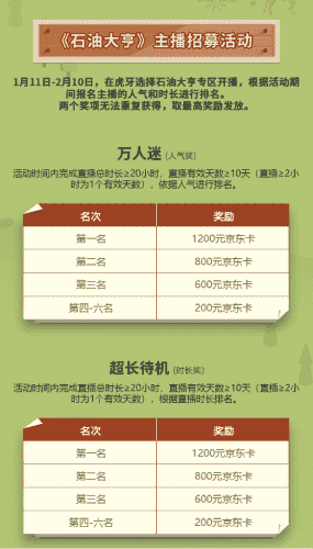 除了“油王”争霸赛,,,精英主播招募活动亦同步开启!!!赛事分时长奖和人气奖,,奖励同样丰厚!!!