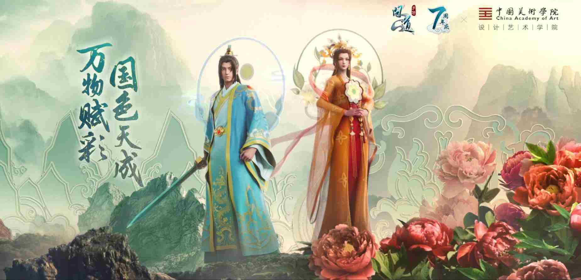 2023年4月,,,,《问道手游》联动中国美术学院,,,,在游戏中融合了中国历史上不同时期的文化元素,,打造了“山河万象”与“凤鸣九霄”的国风时装。。。。在色彩配置方面,,,创作团队基于对游戏角色特性的分析提取相应的文化内涵,,,从每一种色彩的色相、、指代事物和情感出发对应角色属性,,,选定服装的色彩搭配。。。在纹样设计方面,,,,创作团队结合游戏角色自身特殊的造型比例和形态,,在实际的纹样设计中进行了游戏语境下的活化演绎。。。。男性角色集中使用了如蟒纹、、、、海水江崖纹、、如意纹和云气纹等传统纹样元素,,,,女性角色则吸纳了凤凰纹、、牡丹纹、、卷草缠枝纹等元素,,,组成以“双凤牡丹纹样”“缠枝牡丹纹”“金玉凤冠头饰”为主要纹样的游戏角色装饰图案系统。。。。